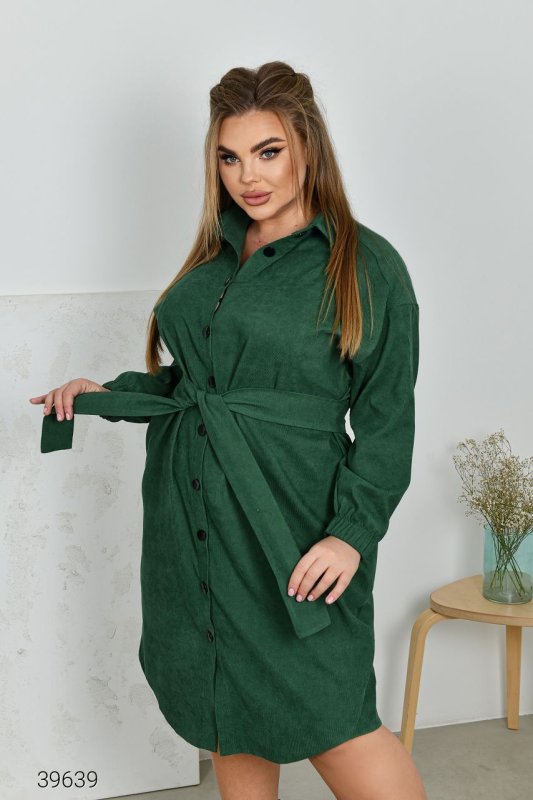 Сукня-сорочка із мікровельвету. Сукня вільного прямого фасону зі стояче-відкладним коміром. Застібається на гудзики. Лінія плеча спущена, рукав на резинці. У бічних швах кишені. Тканина: мокровельвіє, розтяжності не має.