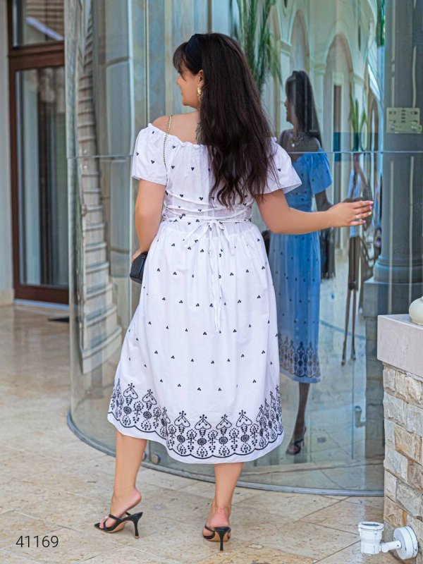 Сукня з вишивкою. Сукню можна моделювати: мотузочки, розташовані в районі грудей, можна зав'язати бантиком або зробити виріз декольте глибше. Позаду шнурівка – регулює приталеність. Тканина: 100% бавовна з вишивкою, натуральна.