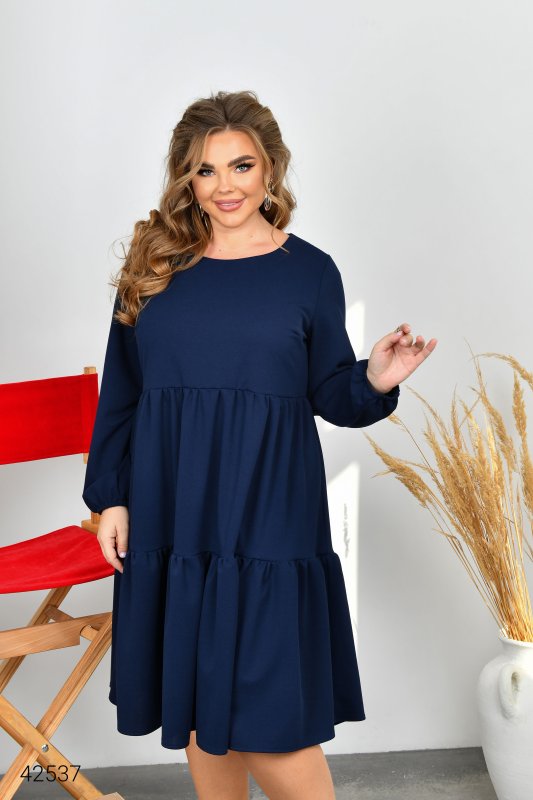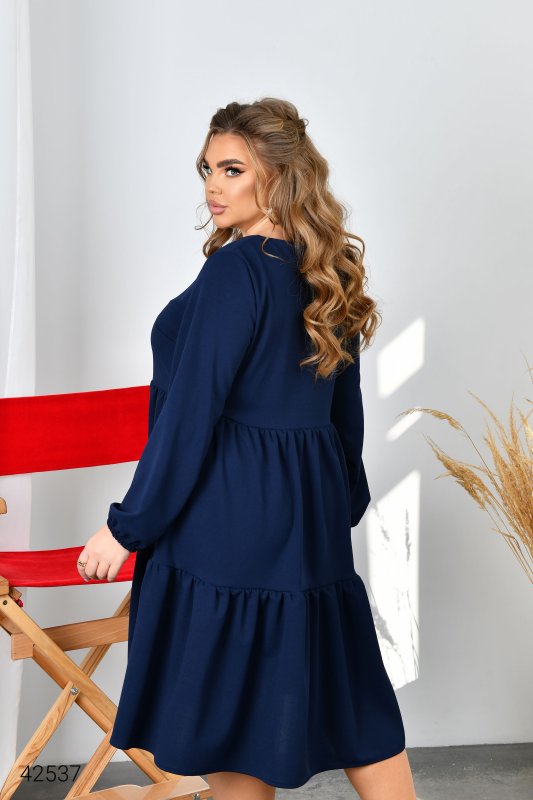 Сукня вільного крою. Спідниця виконана із двох ярусів. Виріз горловини круглий, довгий рукав на гумці.