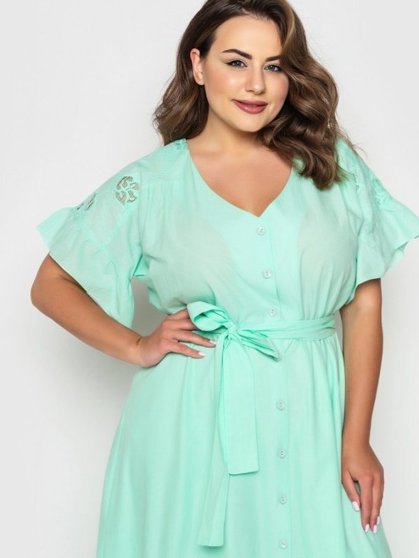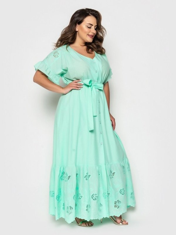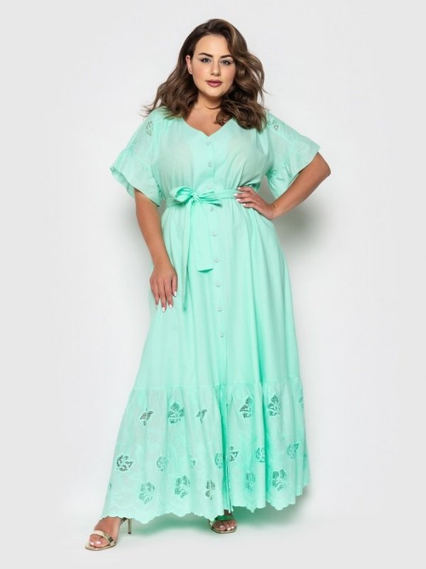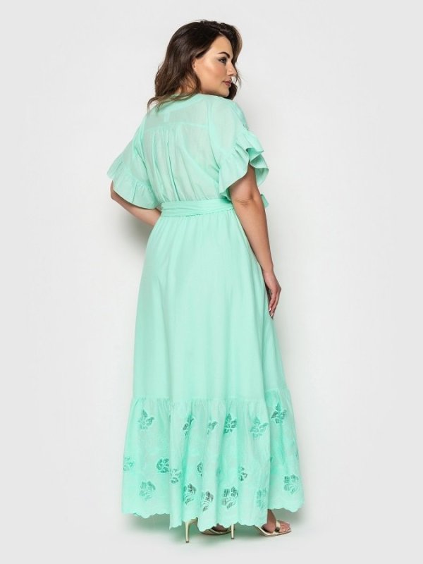 Пишна сукня з батисту з вшитим під'юбником з основного матеріалу. Застібається по переду на гудзики. Низ сукні з воланом, доповненим вишивкою та аплікацією. Аплікація і вишивка присутній так само на рукавах. Манжети з оборкою. Пояс в комплекті.