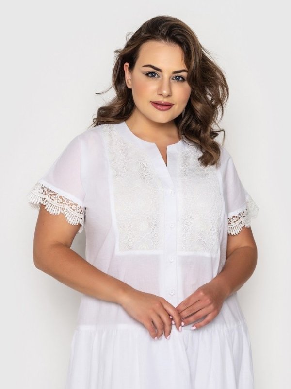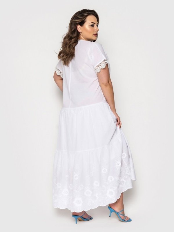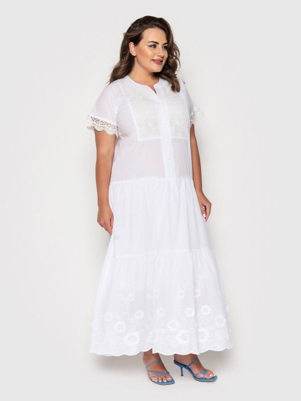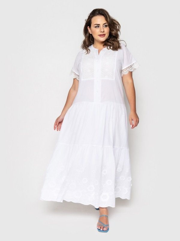 Ніжне і романтичне плаття з вшитим під'юбником з основної тканини. Поличка і рукава оформлені гіпюром. Застібається по переду на гудзики. Спідниця з оборкою прикрашена вишивкою з перфорацією.