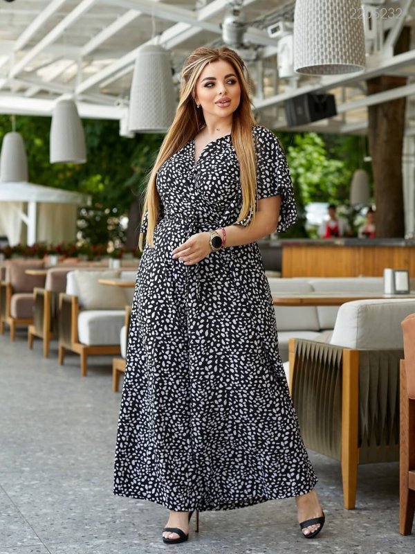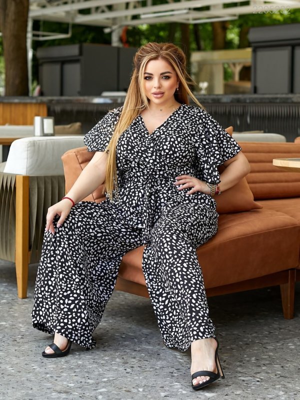 Деталі: А-силует, пишний рукав, глибоке декольте, відрізна талія, штани-палаццо вільного крою з кишенями, застібка - таємна блискавка по спинці. До комбінезону додається пояс.