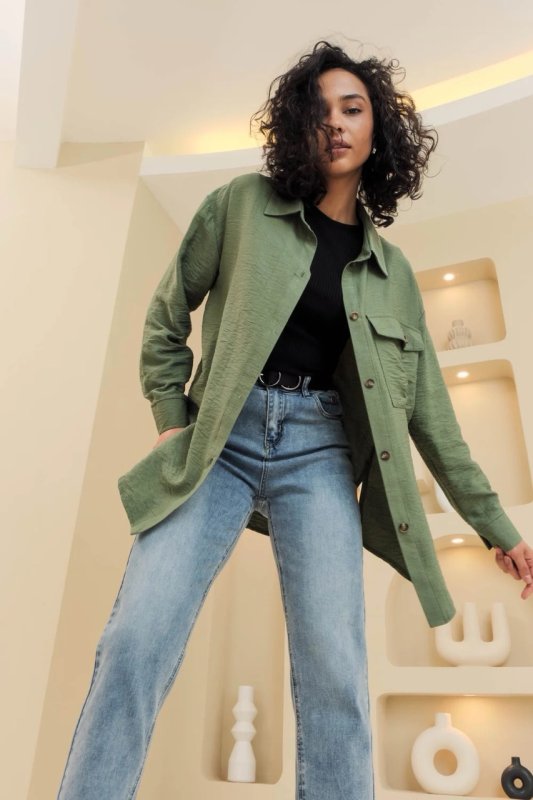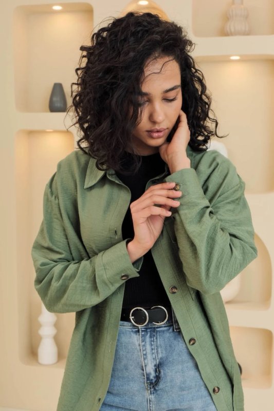 Фасон: вільний, прямий, комір сорочкового типу