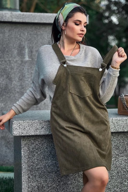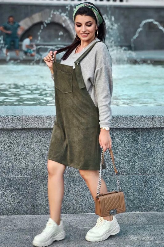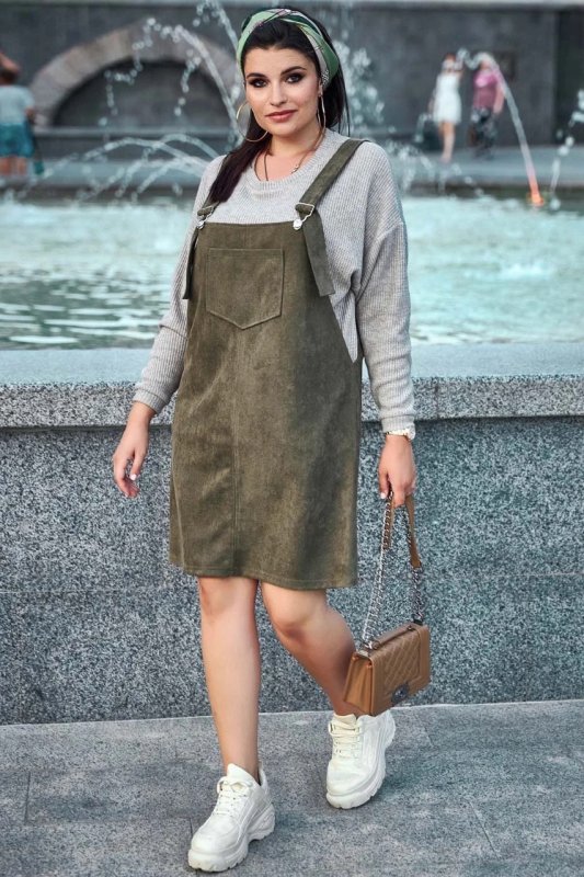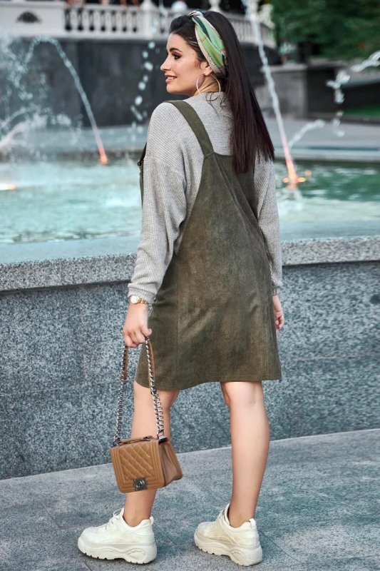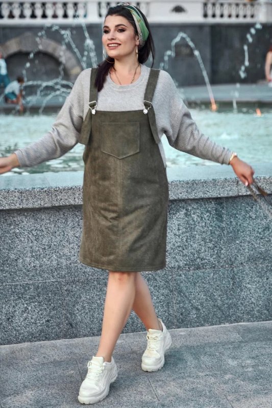 Нова стильна модель – сарафан вільного фасону. Приємна на дотик і красива тканина діагональ-замш надає образу глибини та особливого шарму. Напівприталений крій робить вигідний акцент на перевагах фігури. Головний декоративний штрих моделі – велика накладна кишеня на грудях.