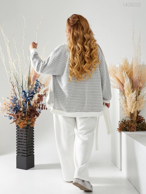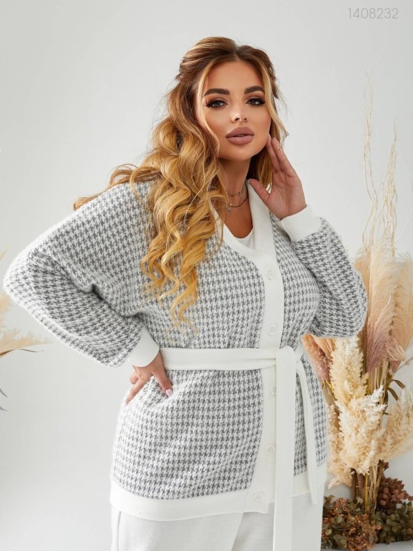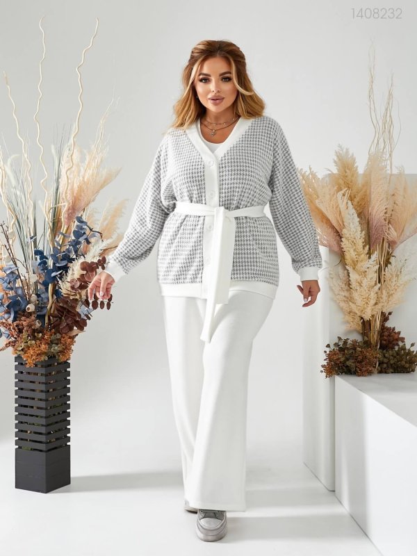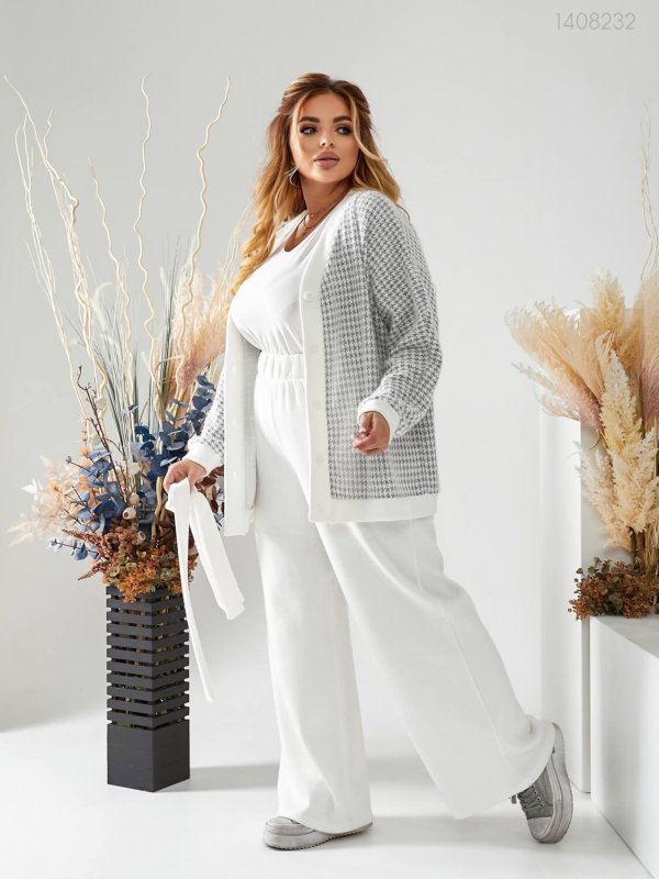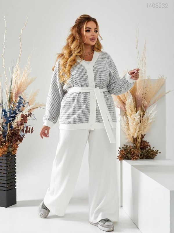 Кардиган вільного крою на гудзиках з поясом. Штани-палаццо високою посадкою з поясом на широкій гумці, глибокими місткими кишенями.