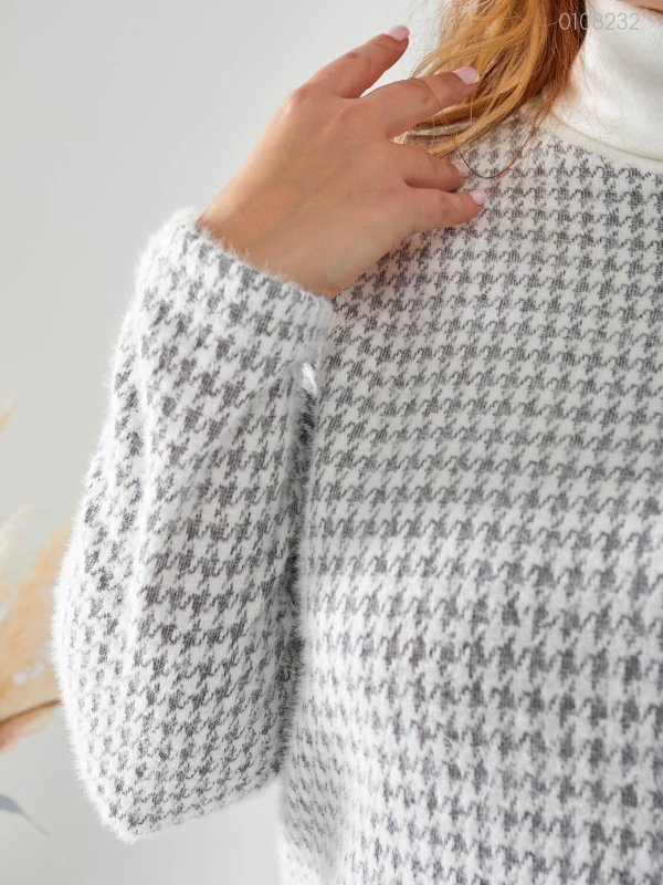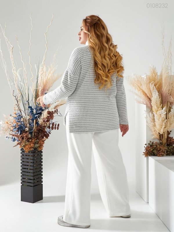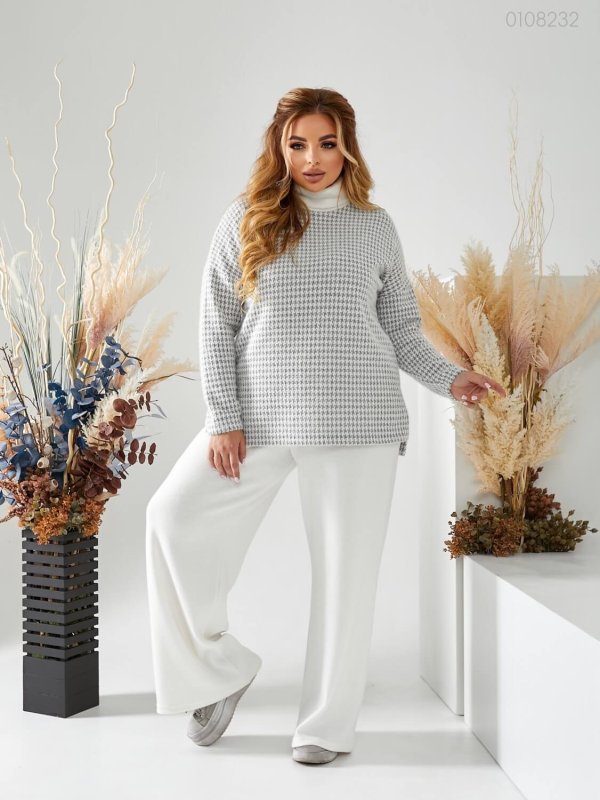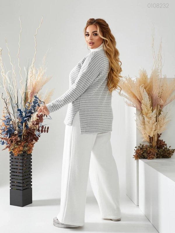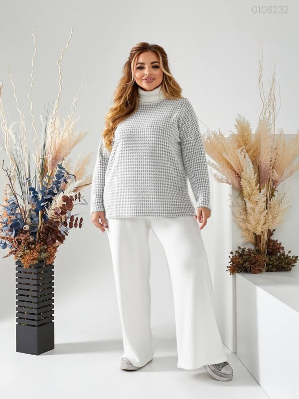 Подробиці: светр з високим подвійним горлом, штани-палаццо з поясом на широкій резинці, з глибокими кишенями в бічних швах.