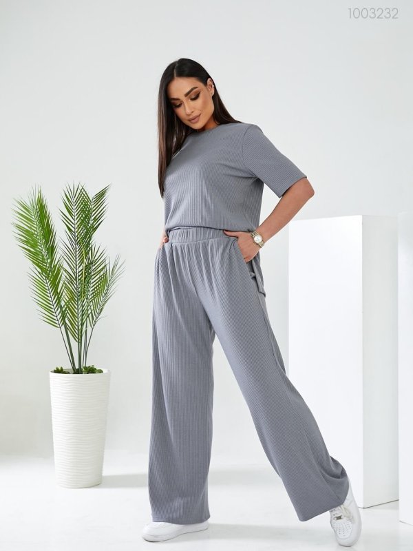 Деталі: довга футболка вільного крою з округлою горловиною та рукавом до ліктя. Штани-палаццо на широкій гумці, з глибокими кишенями.