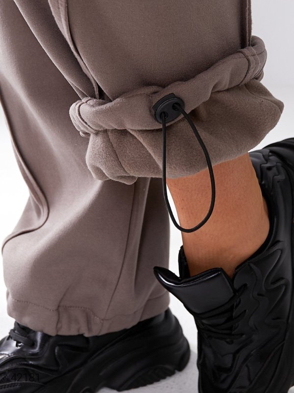 Штани жіночі теплі. Можна носити штани, як прямі, так і як спортивні, зафіксовуючи внизу затяжками. Тканина: трикотаж трьохнитка з начосом.