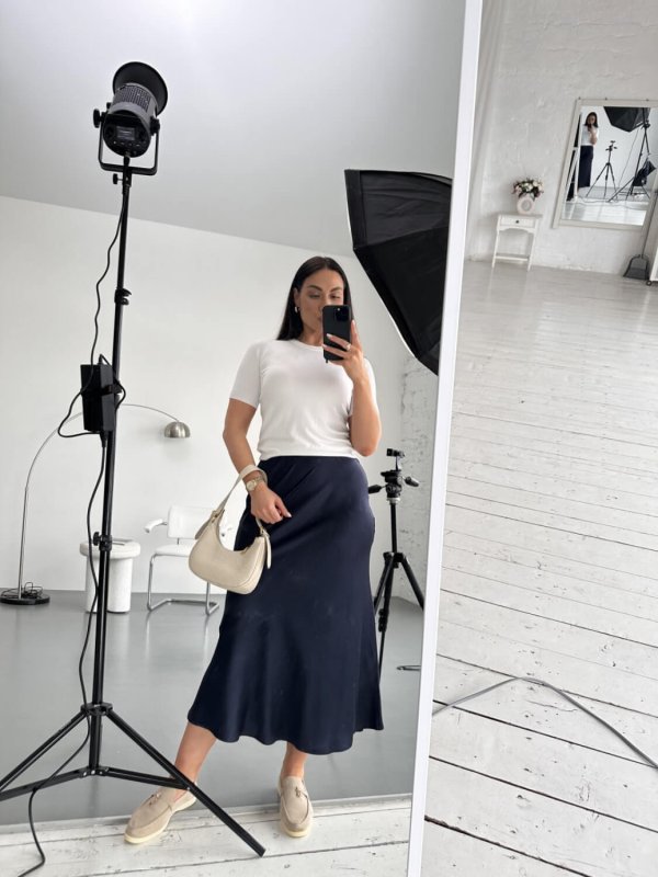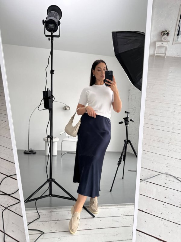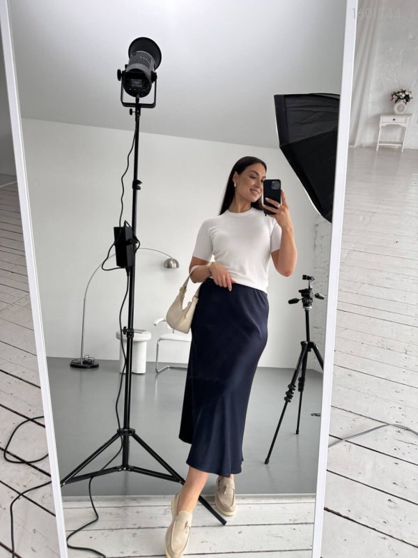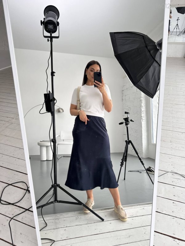 Деталі: спідниця покроєна по косій, за рахунок чого набуває форми тіла, з поясом на гумці, без кишень.