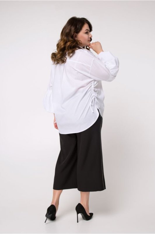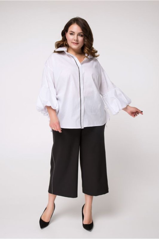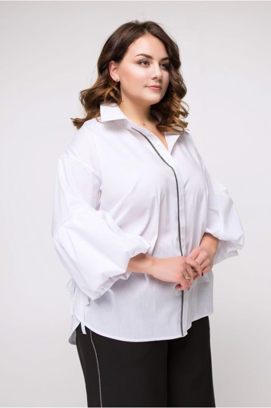 Стильна базова сорочка Ксенія володіє вільним, комфортним кроєм. Манжети рукавів об'єднання роз'ємні з еластичною вставкою. Застібається на гудзики, приховані під планкою. Поличку вироби прикрашає тонка смуга з дрібними стразами. В бокових швах зав'язки з атласними стрічками. Спинка злегка подовжена.