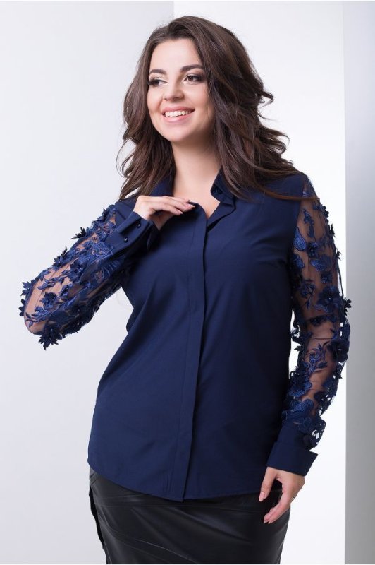 Ефектна жіноча сорочка Пандора додасть романтичність і елегантність будь-якого вашого образу! Модель вільного силуету, рукави прикрашає легка сітка, декорована вишивкою і набивним перлами. Застібається на гудзики, приховані під планкою. Манжети рукавів застібаються на декоративні гудзики. ¶Розміри Довжина виробу Довжина рукава¶ 50 65 см 65 см¶ 52 66 см 65 см ¶ 54 67 см 65 см ¶ 56 68 см 65 см