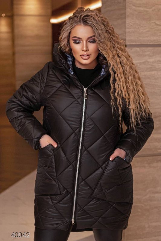 Куртка зі стьобаної плащової тканини на синтепоні. Комір-стійка, манжети на резинці, бокові накладні кишені. Асиметричний нижній край, є підкладка, застібка на блискавку.