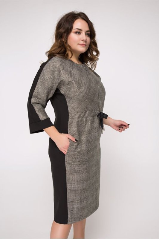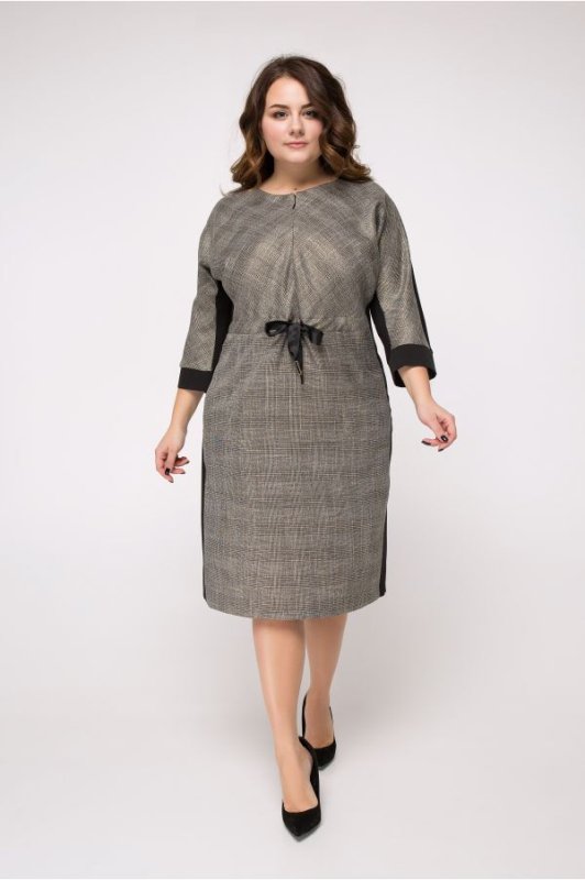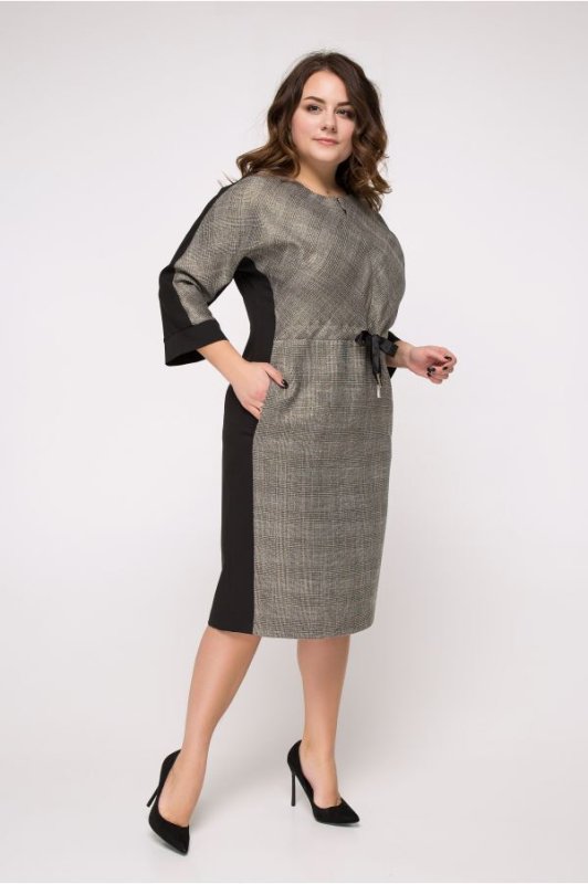 Елегантне повсякденне плаття Алуста створен комбінації з костюмної тканини і тканини з вкрапленнями золотистих ниток люрексу. Прилеглий силует виробу додає куліса по лінії талії. По центру горловини - потайная блискавка, ззаду розріз-шліца, в бічних швах прорізні кишені.