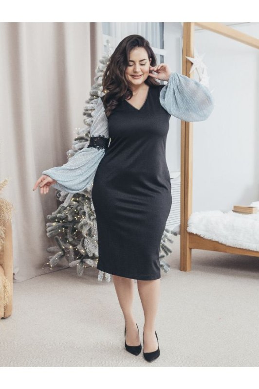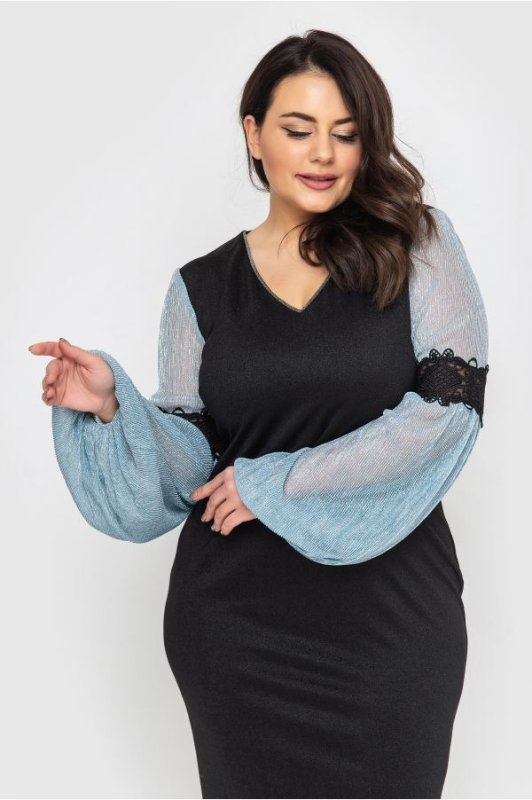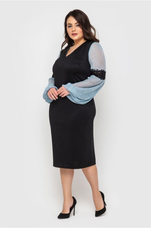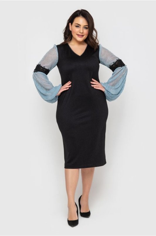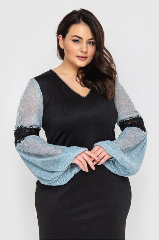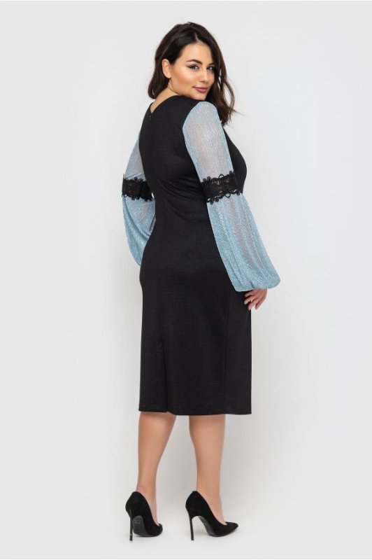 Сукня-футляр з тканини з легким блиском. На горловині полички V-подібний виріз, обрамлений тасьмою з дрібними намистинками. Горловина спинки також з неглибоким V-подібним вирізом. Пишні рукава з сітки з люрексом доповнені еластичними вставками на манжетах і набивним мереживом. Ззаду розріз-шліца. Застібається по центру спинки на потаємну блискавку.