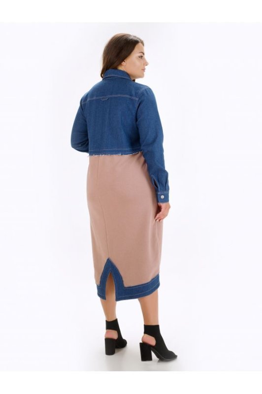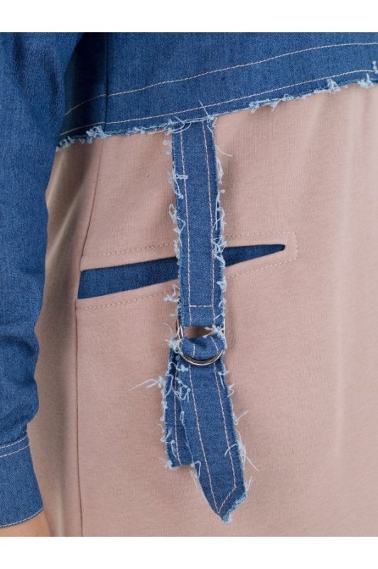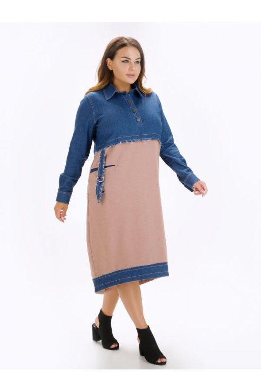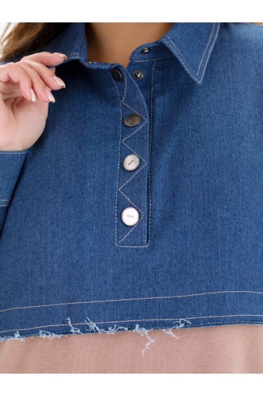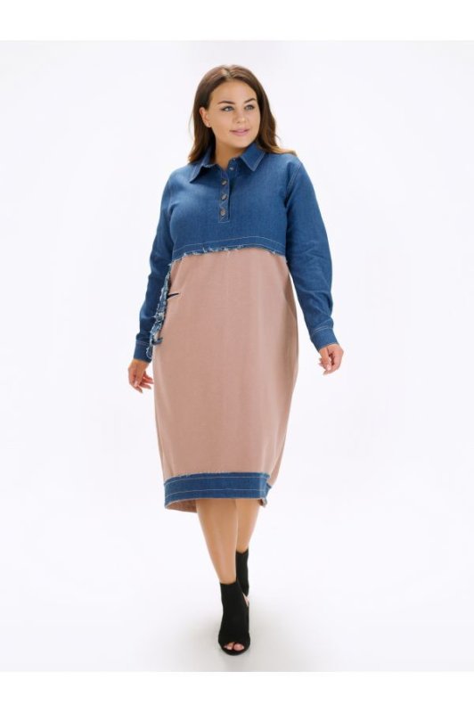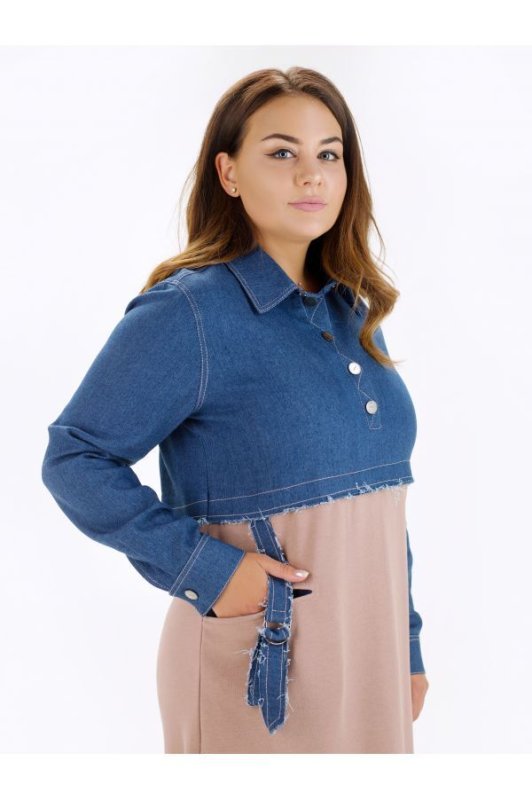 Оригінальна жіноча сукня Евія вільного, комфортного силуету. Створено з комбінації двох типів натуральної тканини. Верх сукні-сорочкового типу, застібається на кнопки по планочці. Манжети рукавів на кнопках. По низу смуга з джинсової тканини, ззаду розріз. Спинка злегка подовжена. На поличці горизонтальна прорізна кишеня, декорована паском з регулюванням.