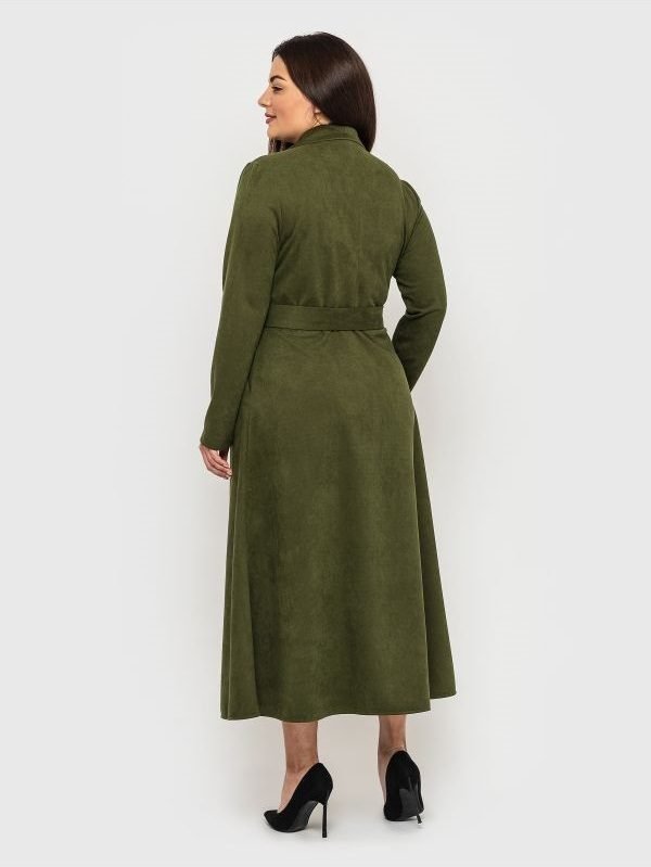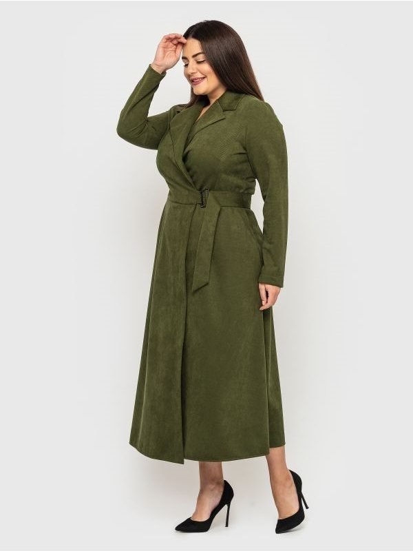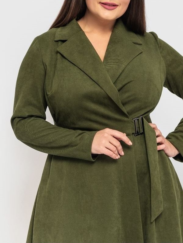 Тепле плаття на запах з відкладним коміром. Відрізна талія, спідниця-полусолнце. Вшитий пояс застібається на пряжку. Збоку коса кишеня.