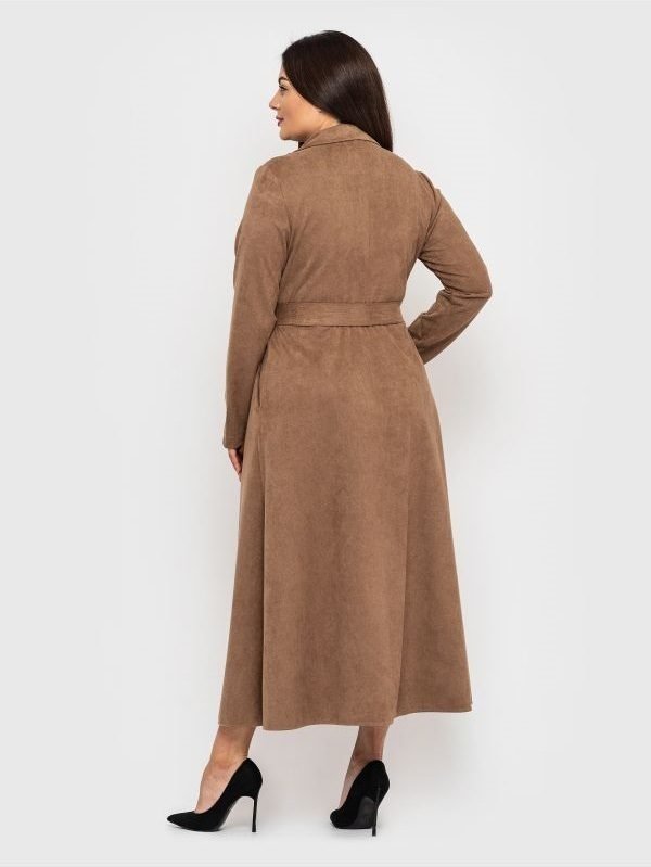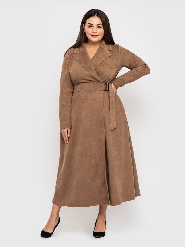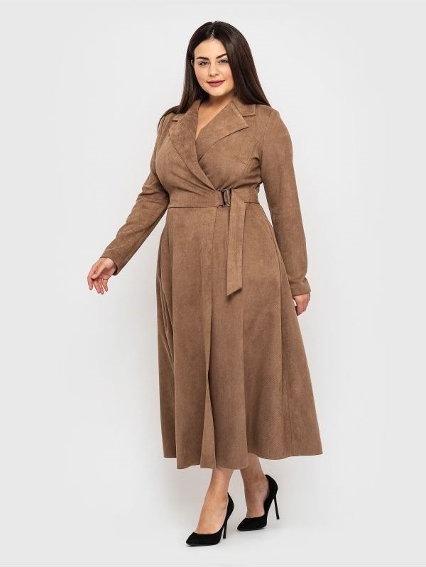 Тепле плаття на запах з відкладним коміром. Відрізна талія, спідниця-полусолнце. Вшитий пояс застібається на пряжку. Збоку коса кишеня.