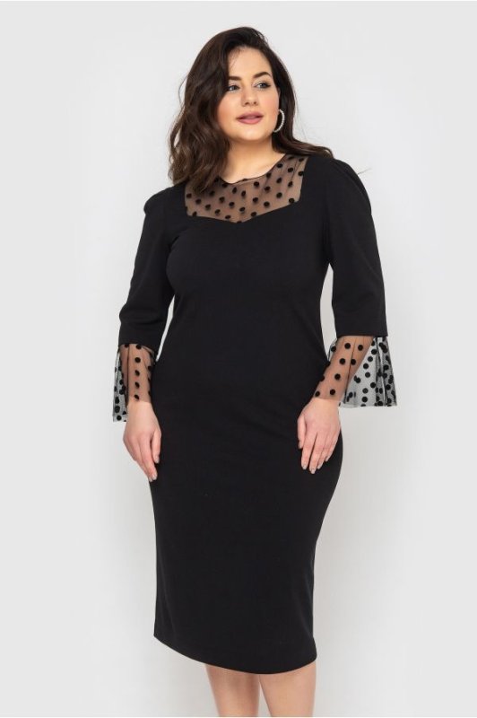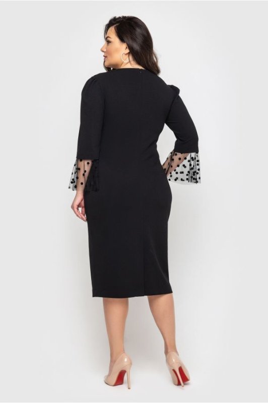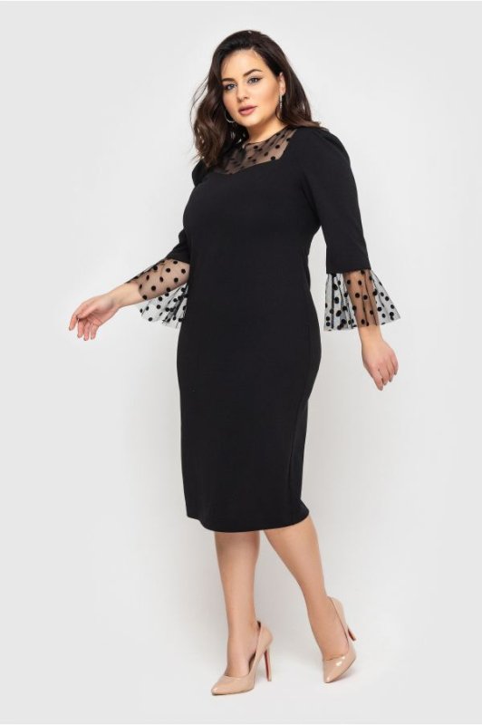 Жіноча сукня Ліза злегка прилеглого силуету з красивим декором у вигляді флокірованої сітки в горошок. Манжети рукавів розкльошеної форми, ззаду розріз-шліца. По центру спинки потайна блискавка.