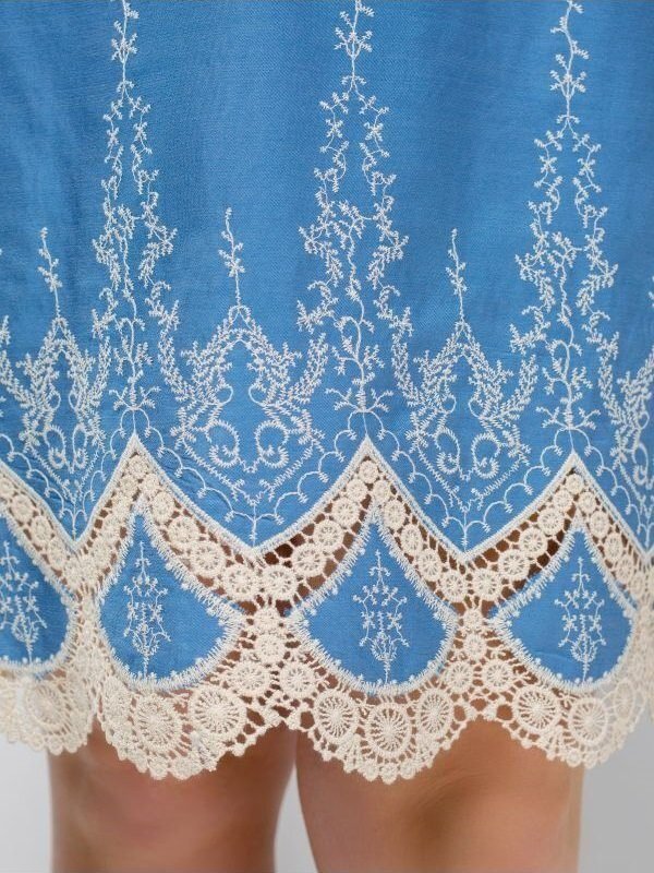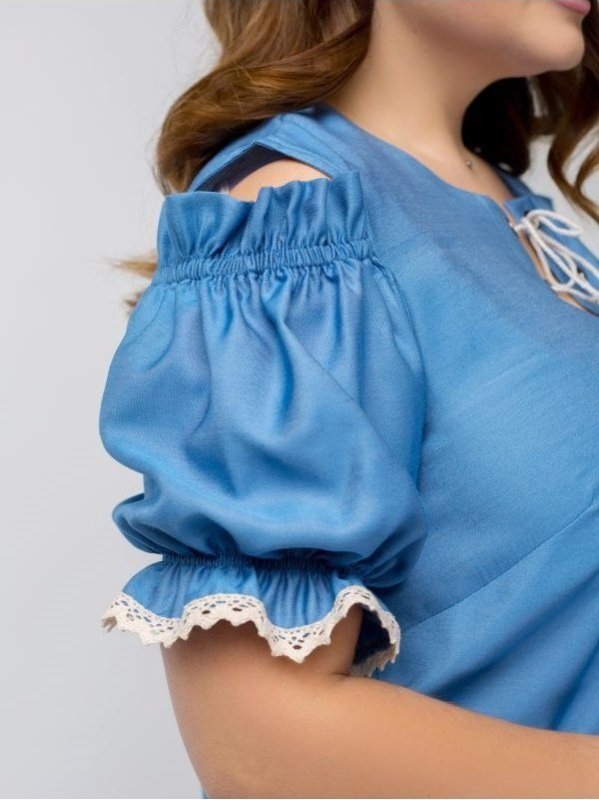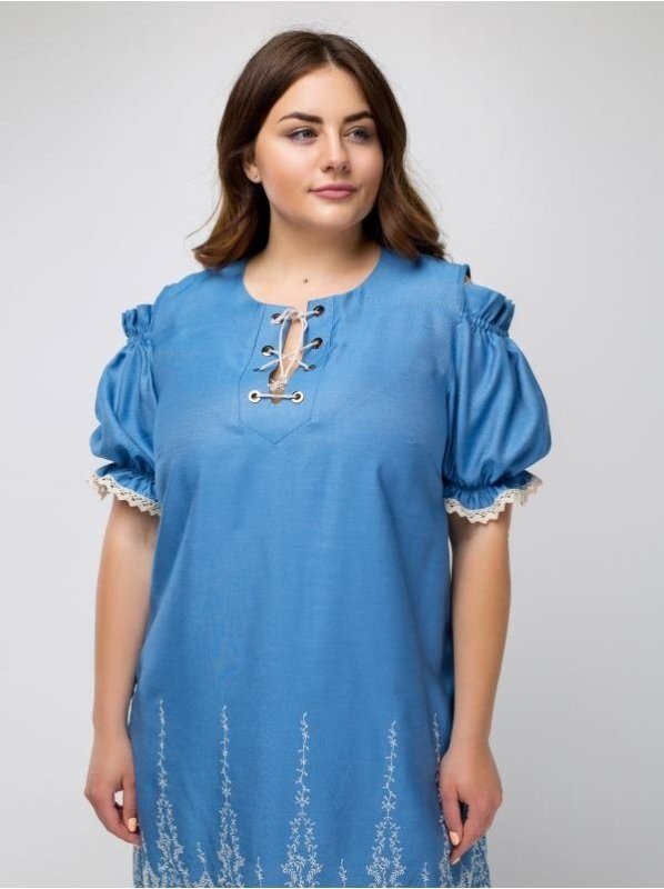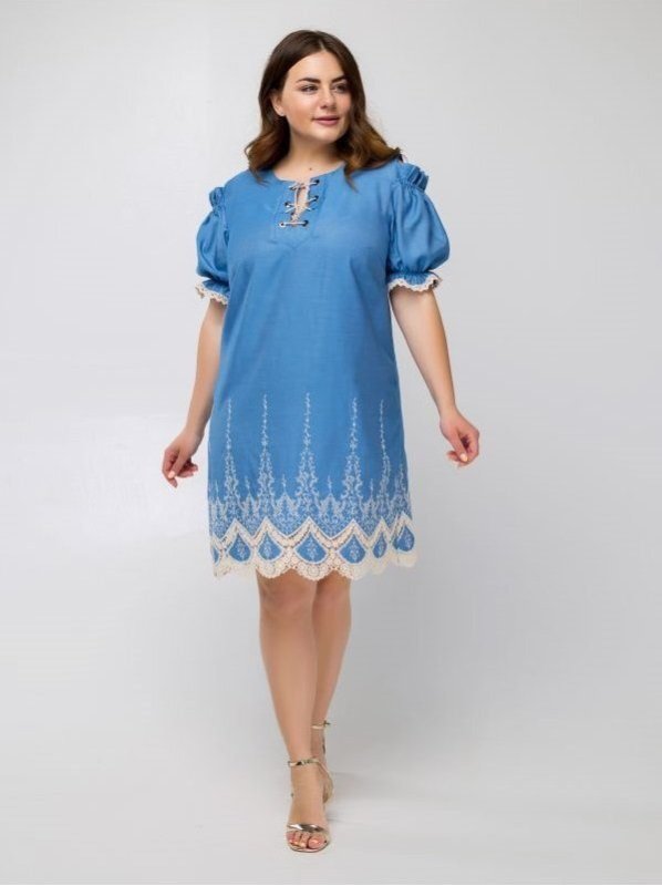 Жіноче плаття Надін вільного силуету, прикрашена гарним мереживом і вишивкою по краю. Особливу чарівність виробу надають оригінальним чином оформлені рукава. Манжети рукавів на гумці. По переду виріз, доповнено люверсами і шнурівкою.