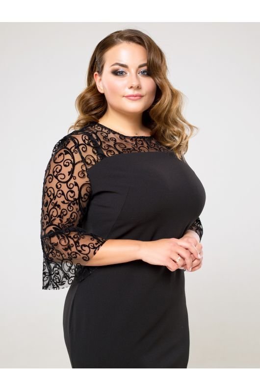 Красиве, елегантне плаття Тріумф, прикрашене флокированной сіткою з мерехтливими вкрапленнями. Модель доповнюють оригінальні рукава з розкльошеними манжетами і защипами. У центральному шві спинки потайна блискавка. Позаду - розріз.