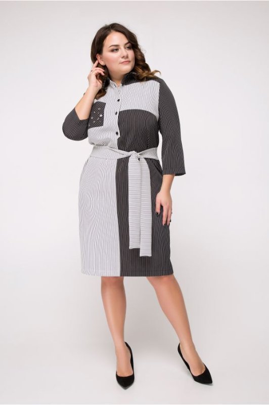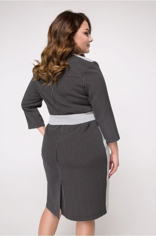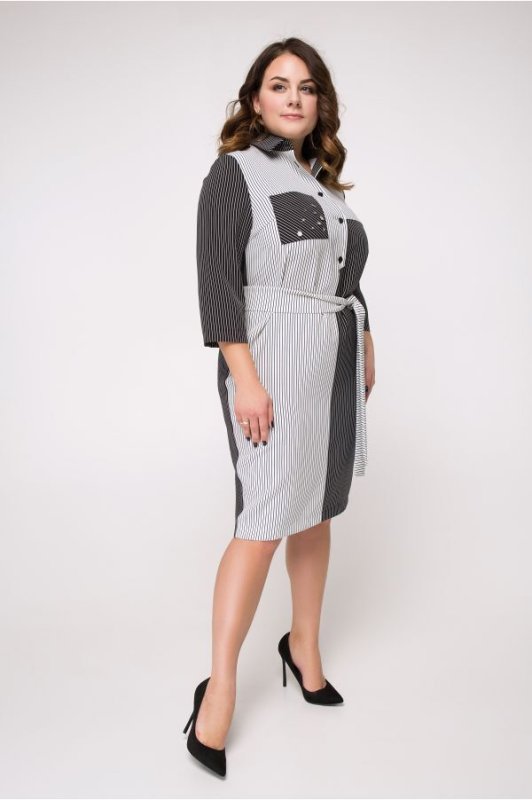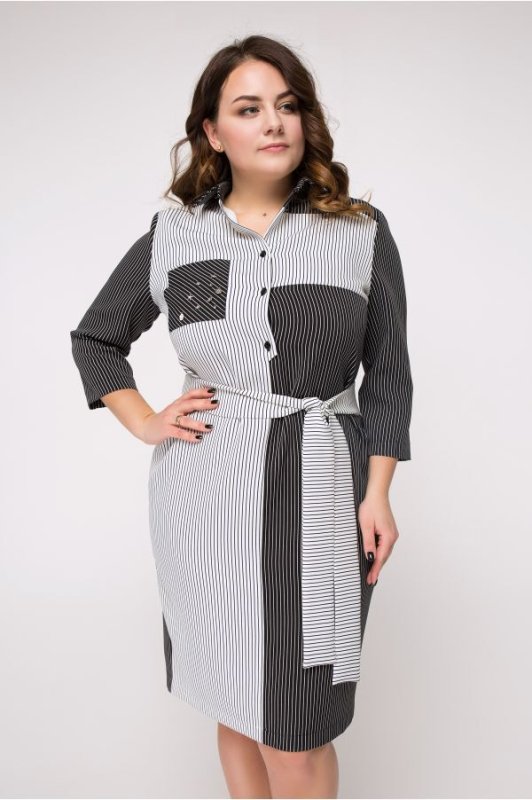 Лаконічне сукню в актуальну в цьому сезоні смужку. Виконано з комбінації тканин контрастних відтінків, знімний тканинний пояс в комплекті. Застібається на гудзики по переду. На поличці накладної нагрудний кишеню, декорована металевими елементами. Ззаду розріз-шліца.