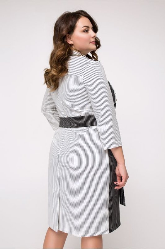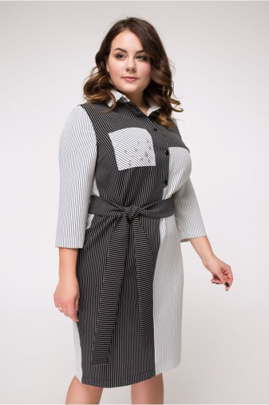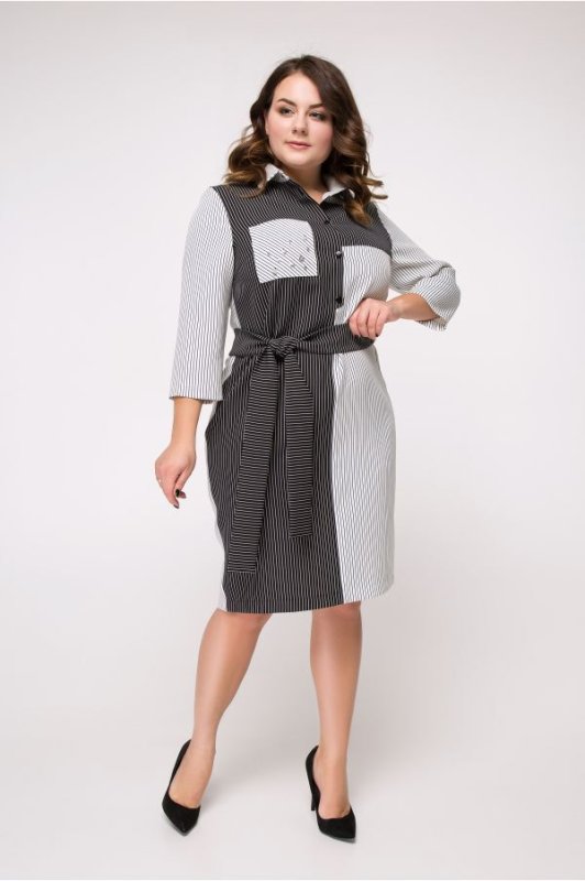 Лаконічне сукню в актуальну в цьому сезоні смужку. Виконано з комбінації тканин контрастних відтінків, знімний тканинний пояс в комплекті. Застібається на гудзики по переду. На поличці накладної нагрудний кишеню, декорована металевими елементами. Ззаду розріз-шліца.