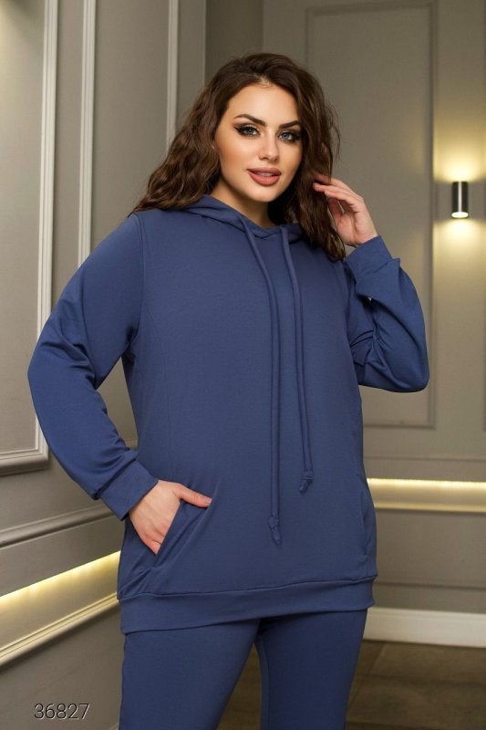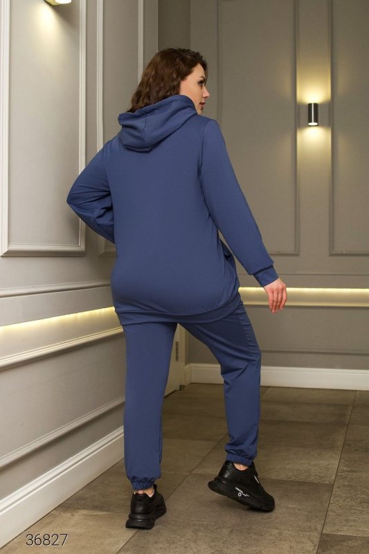 Костюм з якісного трикотажу двухніті. Худі з об'ємним капюшоном з затягується шнурком, бічні прорізні кишені, еластичні манжети. Джоггери з поясом і манжетами на гумці, бічні прорізні кишені.