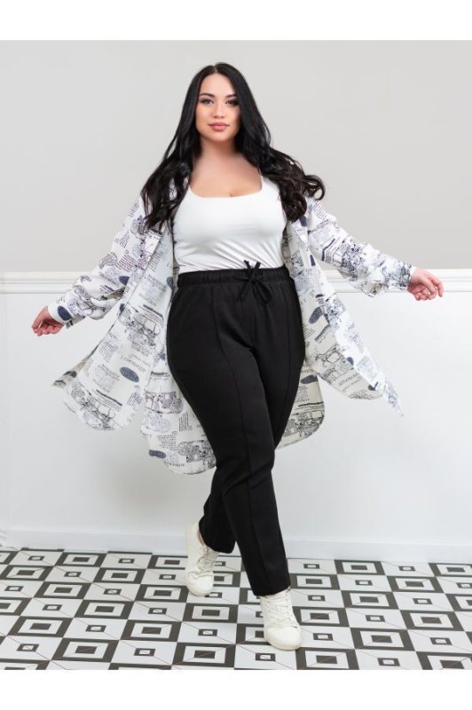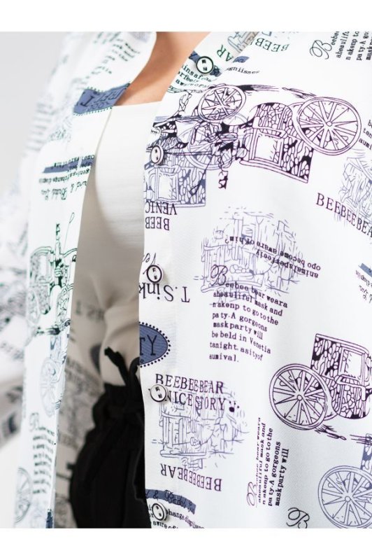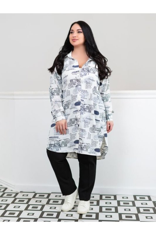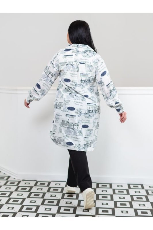 Легка принтована сорочка-сукня володіє вільним, що не утрудняє рухів кроєм. Спинка виробу подовжена, з боків розрізи. Сорочка і манжети рукавів застібаються на гудзики.