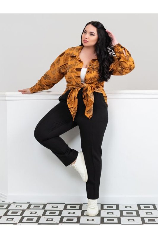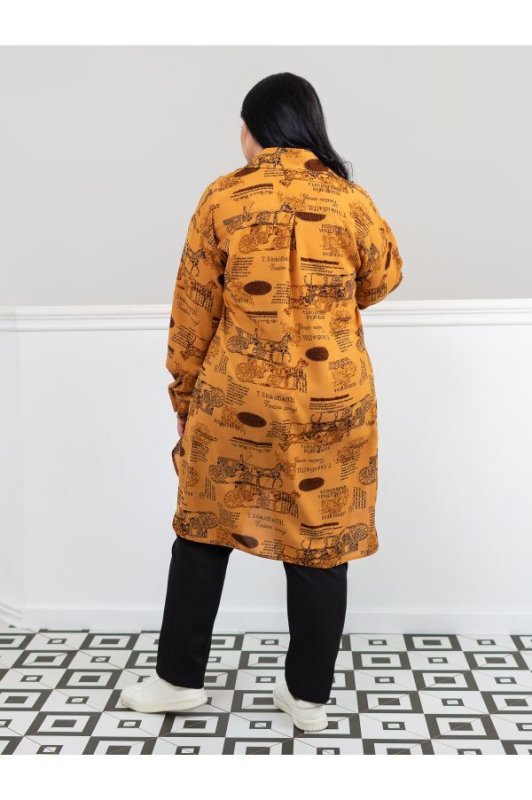 Легка принтована сорочка-сукня володіє вільним, що не утрудняє рухів кроєм. Спинка виробу подовжена, з боків розрізи. Сорочка і манжети рукавів застібаються на гудзики.