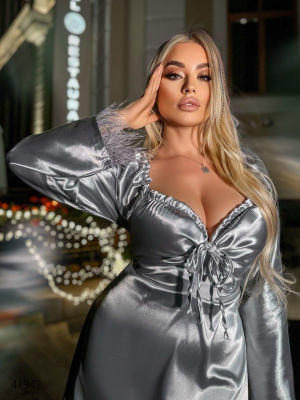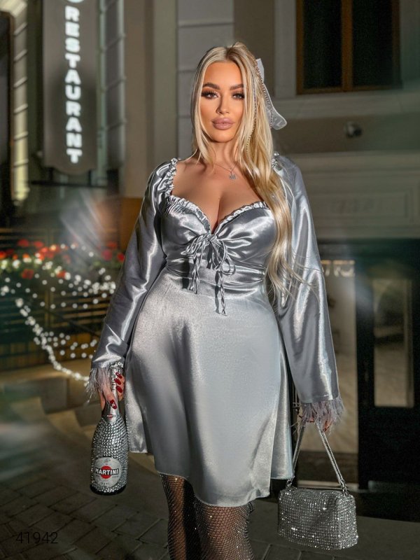 Вечірня сукня великих розмірів. Низ рукавів декорований пір'ям. На спинці шнурівка – регулює приталеність. Сукню можна моделювати: мотузочки, розташовані в районі грудей, можна зав'язати бантиком або зробити виріз декольте глибшим, надіти на плечі або оголити їх.