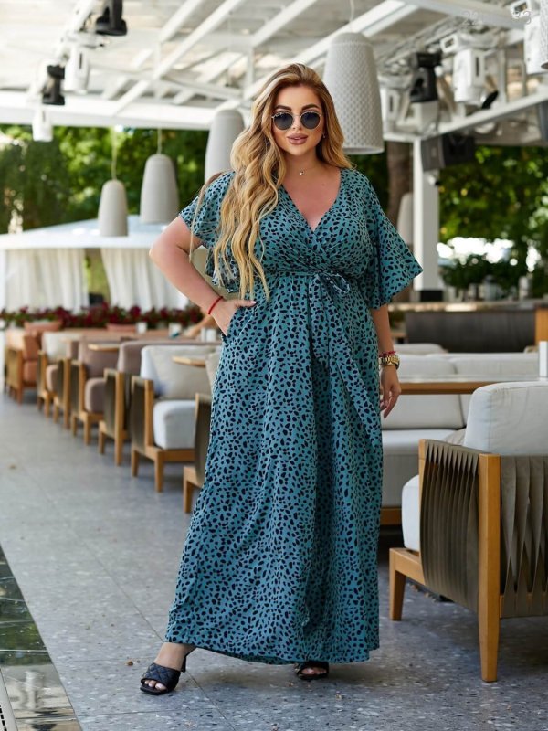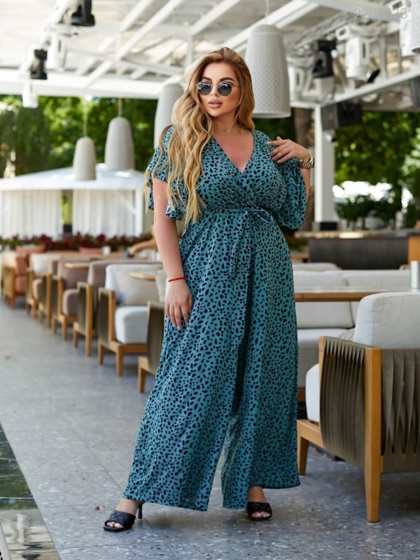 Деталі: А-силует, пишний рукав, глибоке декольте, відрізна талія, штани-палаццо вільного крою з кишенями, застібка - таємна блискавка по спинці. До комбінезону додається пояс.