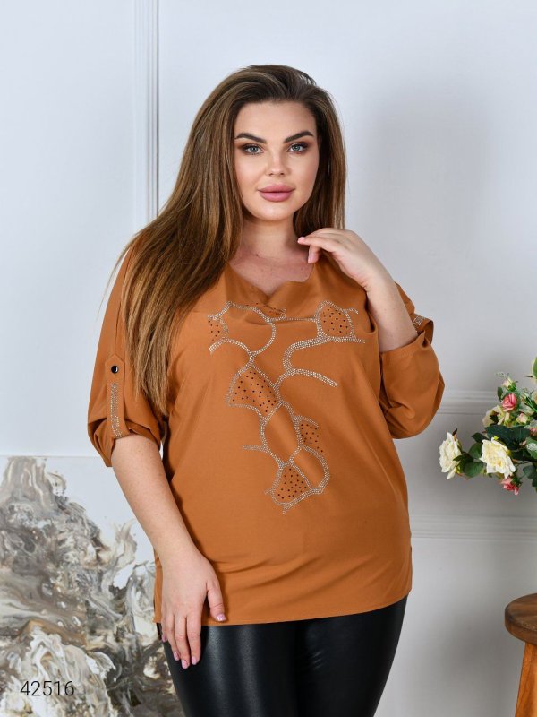 Жіноча блузка вільного крою. Жіноча блузка вільного крою. Силует блузки вільний. Горловина кругла. Рукав прямий, коротшає за допомогою спеціальної деталі на гудзику. Низ асиметричний, спереду трохи коротший, з обох боків невеликі розрізи. Блуза декорована аплікацією з якісних страз.