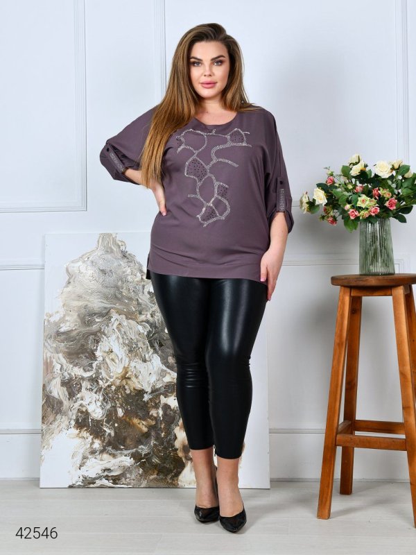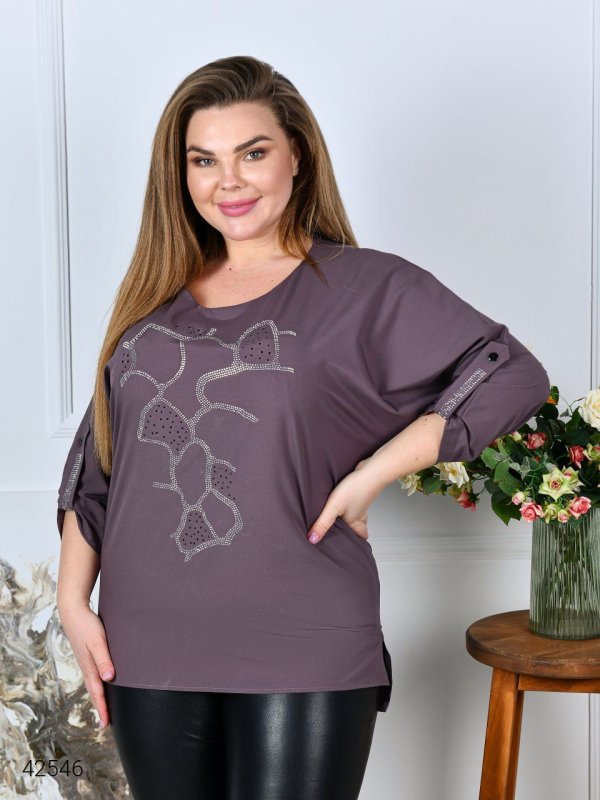 Жіноча блузка вільного крою. Жіноча блузка вільного крою. Силует блузки вільний. Горловина кругла. Рукав прямий, коротшає за допомогою спеціальної деталі на гудзику. Низ асиметричний, спереду трохи коротший, з обох боків невеликі розрізи. Блуза декорована аплікацією з якісних страз.
