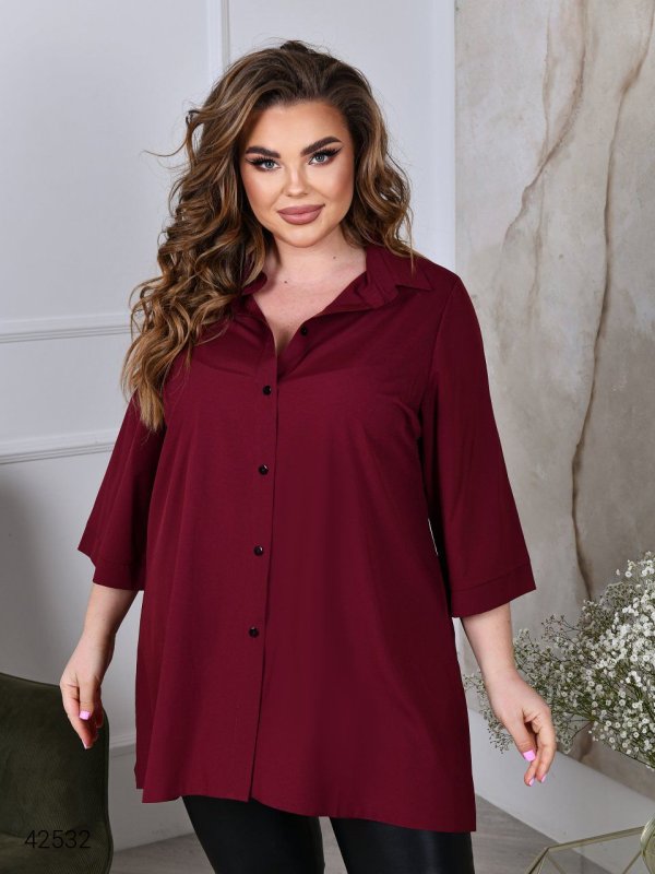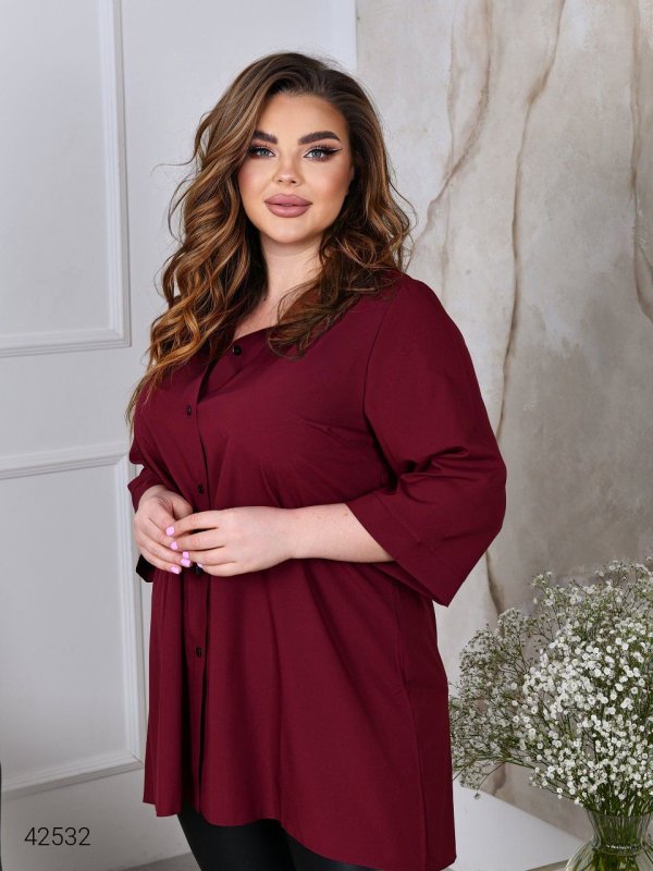 Сорочка жіноча великих розмірів. Силует вільний, А-подібний. Рукав широкий, прямий, завдовжки трохи нижче ліктя.