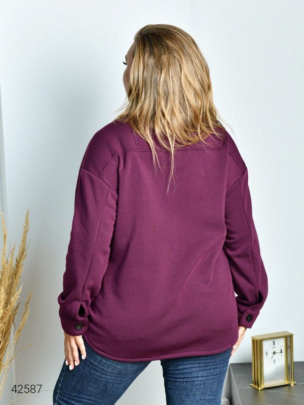 Жіноча сорочка великих розмірів. Сорочка застібається на гудзики. Лінія плеча спущена. Рукав на манжеті з гудзиком. Є дві нагрудні і дві прорізні кишені.