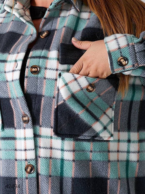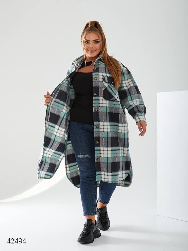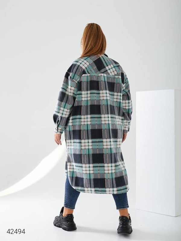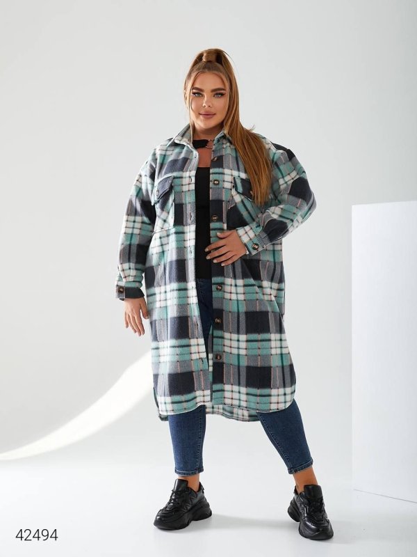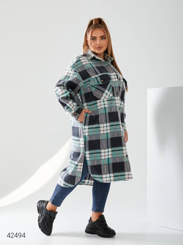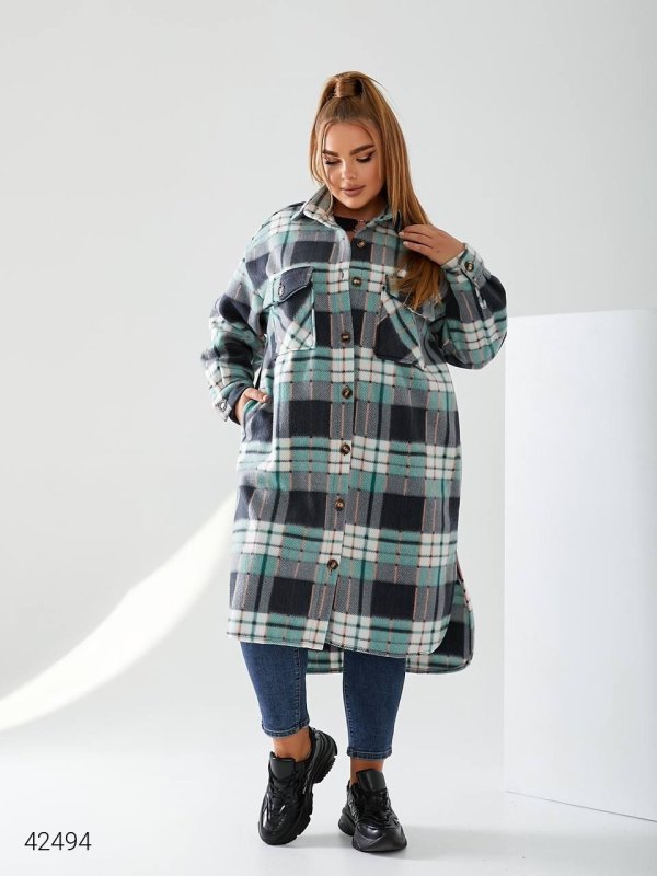 Подовжена жіноча сорочка. Сорочка у стилі оверсайз, подовженого крою із закругленими розрізами з боків. Сорочка застібається на гудзики. На грудях об'ємні та функціональні кишені, з боків урізні кишені. Рукав на манжеті.