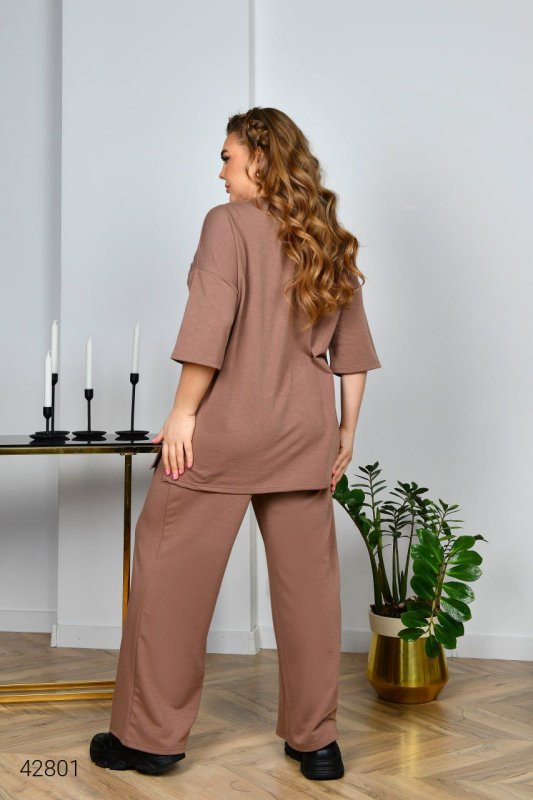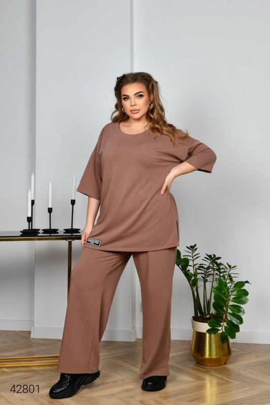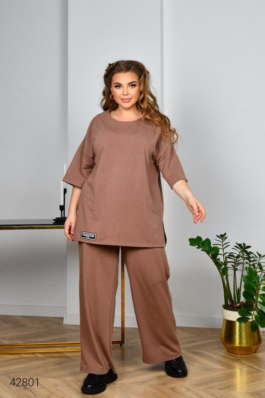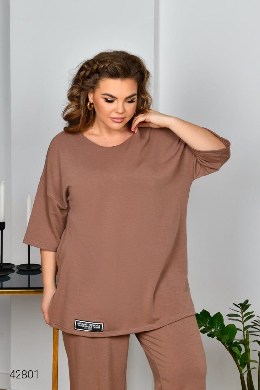 Костюм жіночий великих розмірів. Туніка прямого вільного силуету. Виріз горловини круглий. Лінія плеча спущена, рукав прямий, довжиною 3/4. Низ оформлено двома розрізами з боків. Туніка декорована якісною нашивкою. Штани прямого силуету, по талії зібрані на гумку. В бічних швах оброблені кишені.