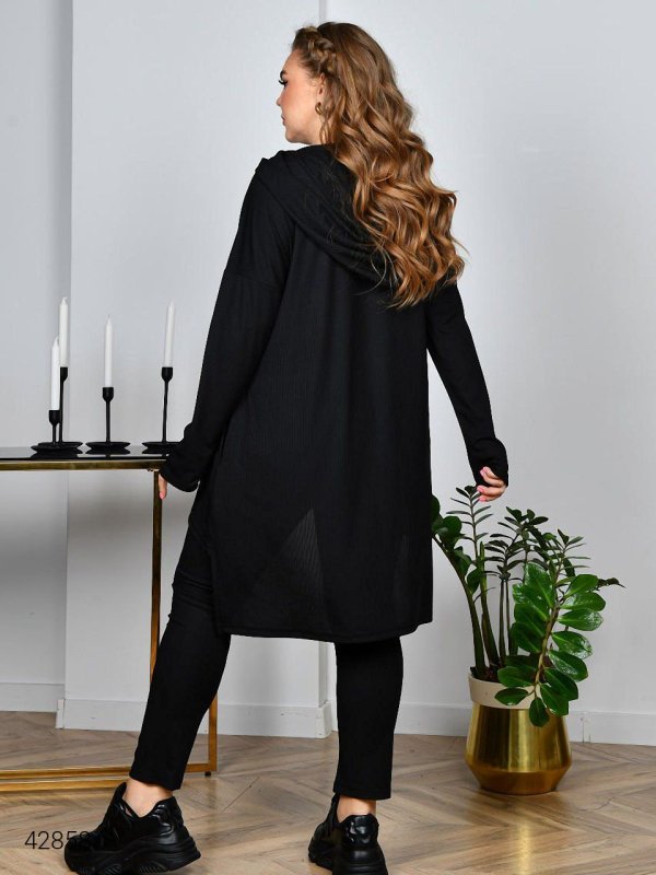 Жіночий костюм з туніки та лосин. Туніка та лосини із якісного трикотажу рубчик (розтяжність гарна, не кошлатиться). Туніка прямого подовженого силуету з асиметричним низом (попереду коротше, позаду довше). Оздоблена оригінальним коміром, що переходить у капюшон. Лінія плеча спущена, рукав довгий. В бічних швах оброблені кишені. Лосини з посадкою, вищою за середню, по талії зібрані на гумку. Кишень немає.