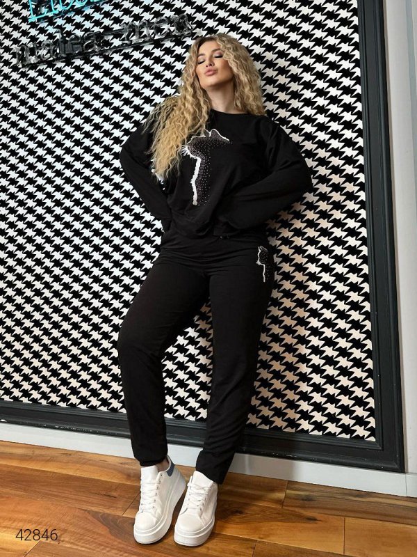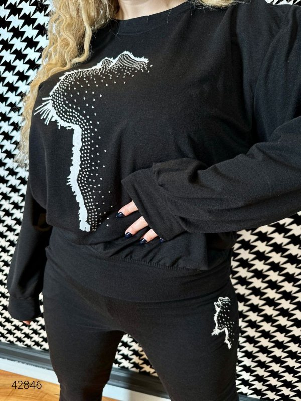 50-52 (ОГ – 120 см, ОТ по манжету кофти - 110 см, ОТ по гумці штанів - 80 см (у розтягнутому 120 см), ОС - 120 см. Довжина штанів - 100 см, кофти - 61 см)