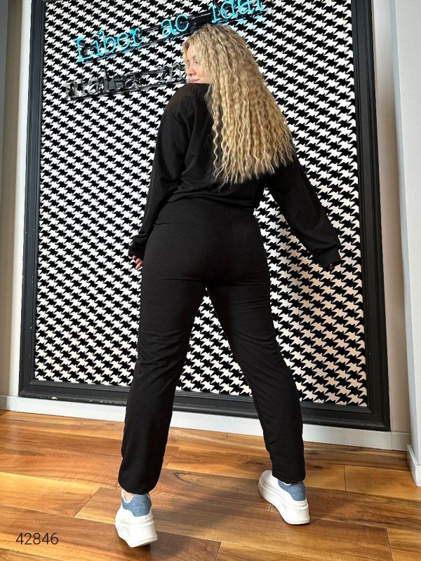 58-60 (ОГ – 140 см, ОТ по манжету кофти - 122 см, ОТ по гумці штанів 100 см (у розтягнутому - 136 см), ОС - 140 см. Довжина штанів - 100 см, кофта - 63 см)