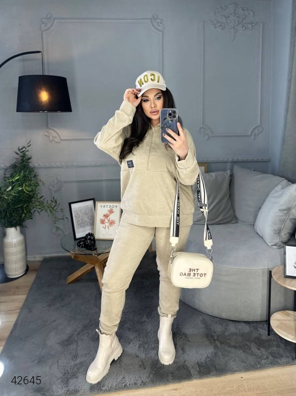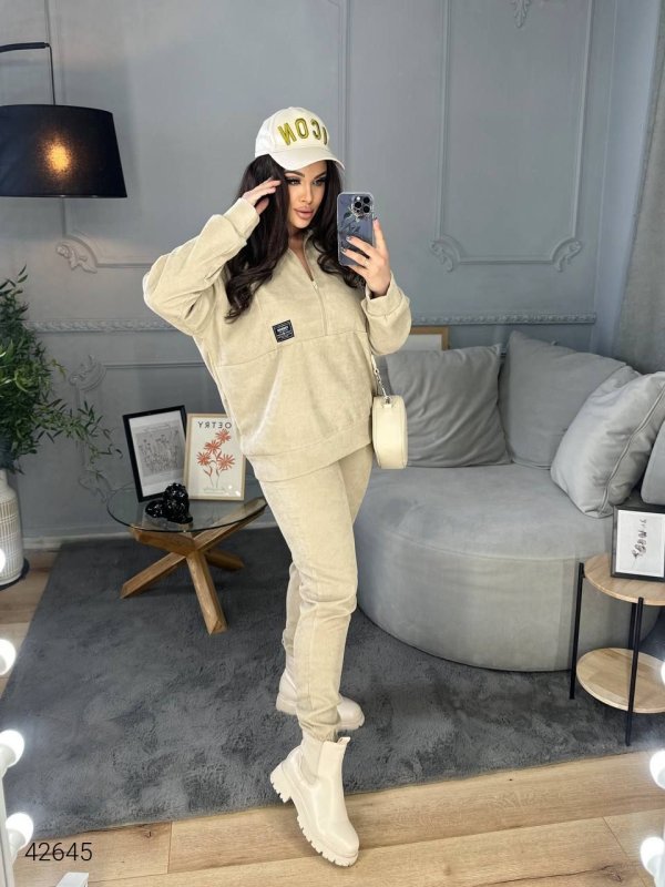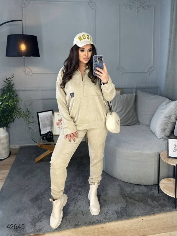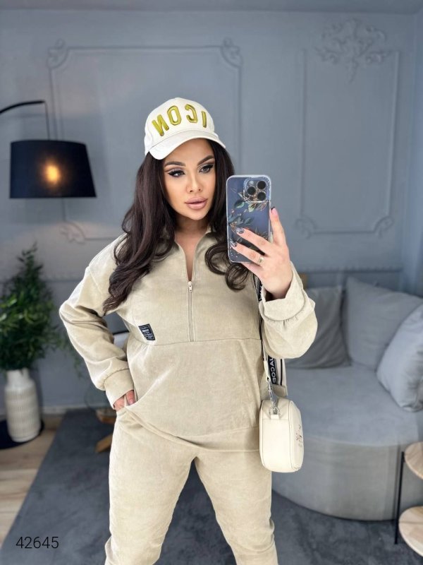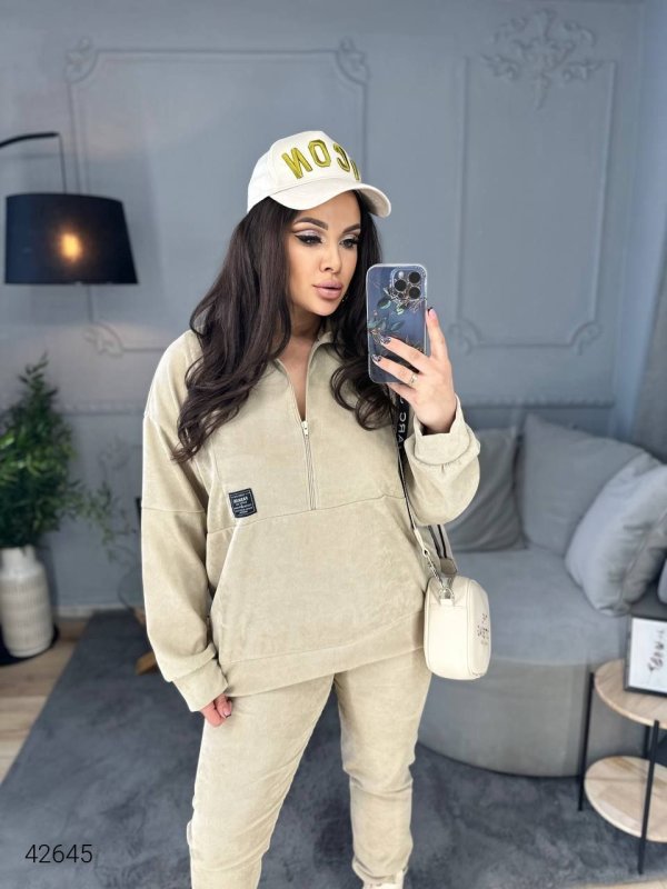 Жіночий костюм плюс сайз із мікровельвету 42645 бежевий