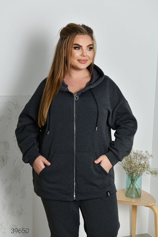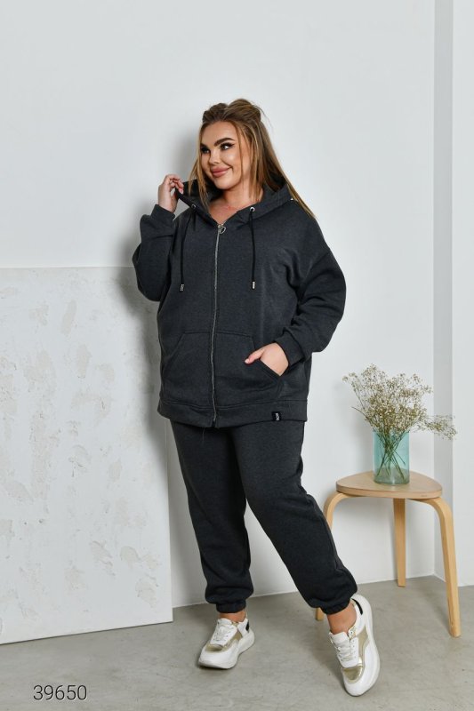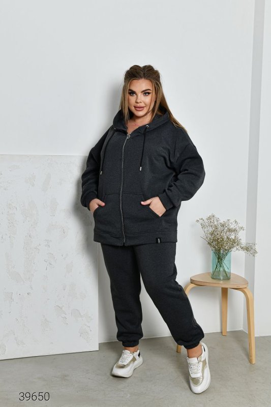 Жіночий теплий костюм. Кофта з капюшоном, в куліскі якого шнурок. Застібається на блискавку, лінія плеча спущена, накладні кишені «кенгуру». Штани з посадкою вище за середню. По талії зібрано на гумку. У бічних швах кишені. Низ штанин на резинці. Тканина: трикотаж тринить з начісом (розтяжність середня).