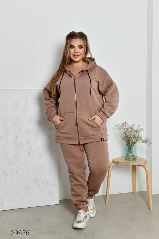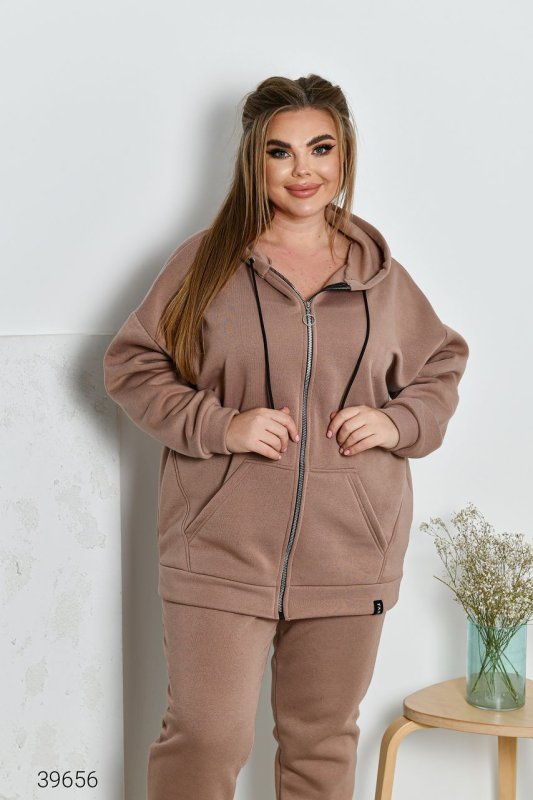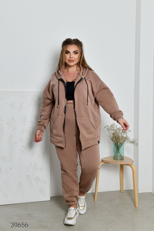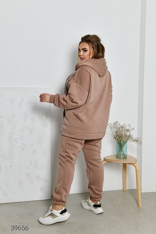 Жіночий теплий костюм. Кофта з капюшоном, в куліскі якого шнурок. Застібається на блискавку, лінія плеча спущена, накладні кишені «кенгуру». Штани з посадкою вище за середню. По талії зібрано на гумку. У бічних швах кишені. Низ штанин на резинці. Тканина: трикотаж тринить з начісом (розтяжність середня).