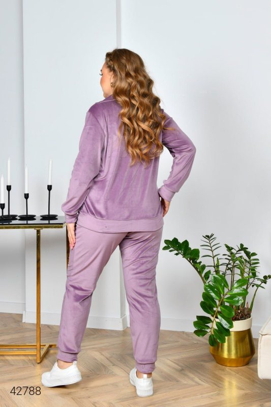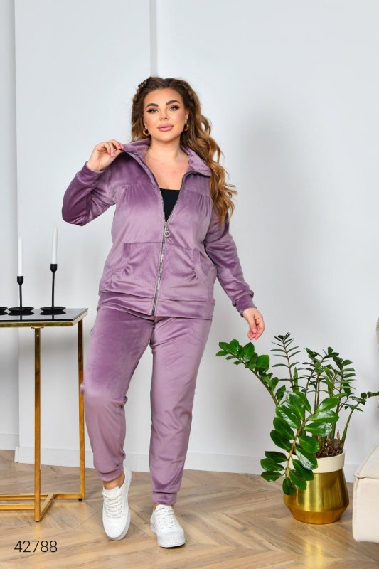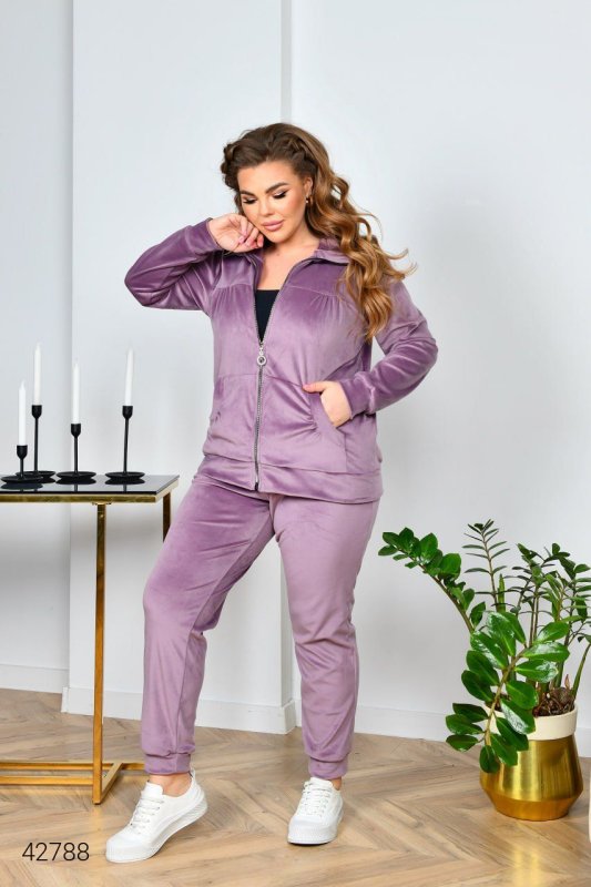 Велюровий костюм жіночий. Застібається на блискавку. Рукав на манжеті. Попереду оброблені кишені «кенгуру». Штани по талії зібрані на гумку. Низ на манжетах.