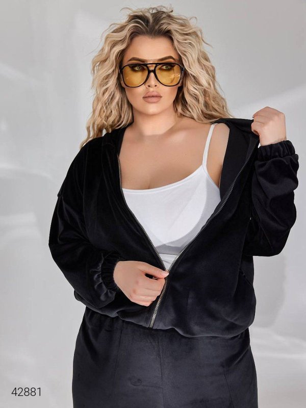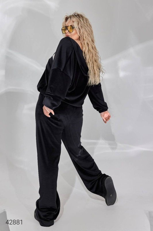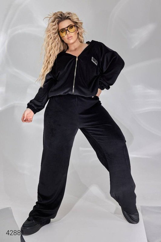 Жіночий велюровий костюм. Штани - висока посадка, талія на гумці, дві кишені. Худі на гумці. Застібається на блискавку.