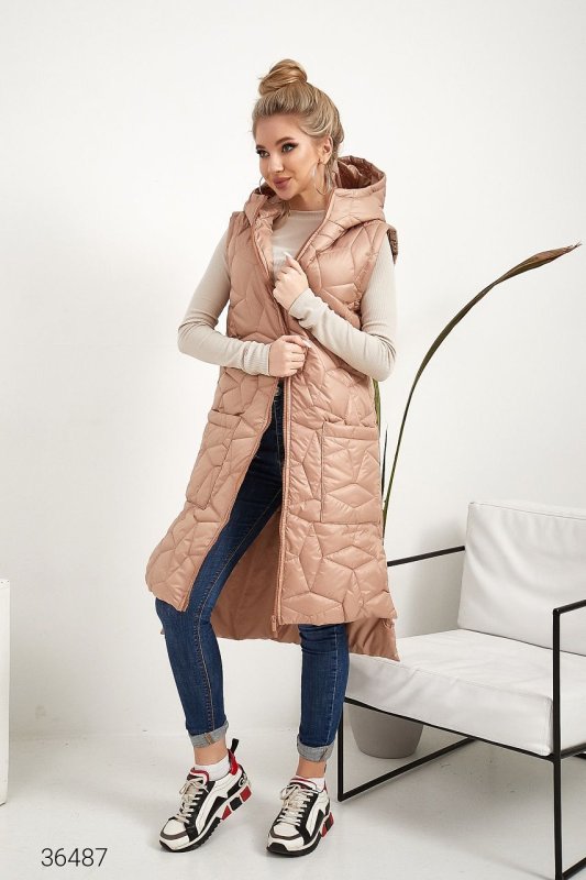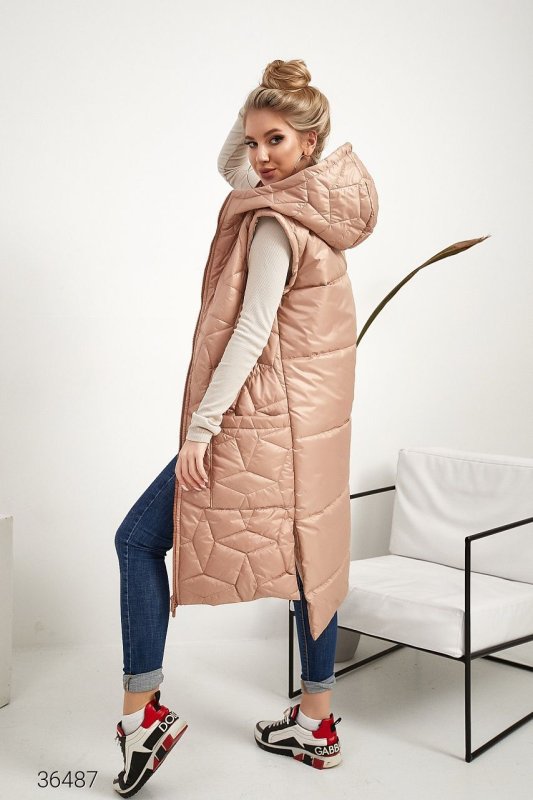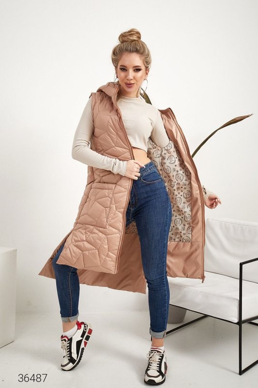 Жилет из качественной плащевой ткани на синтепоне. Объёмный капюшон, боковые накладные карманы, асимметричный нижний край с боковыми разрезами. Есть подкладка с контрастным принтом, застёжка на молнию.