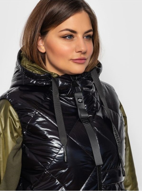 Предусмотрены крупные накладные карманы с клапанами. Проймы собраны на резинку, по краю жилета также проходит резинка.